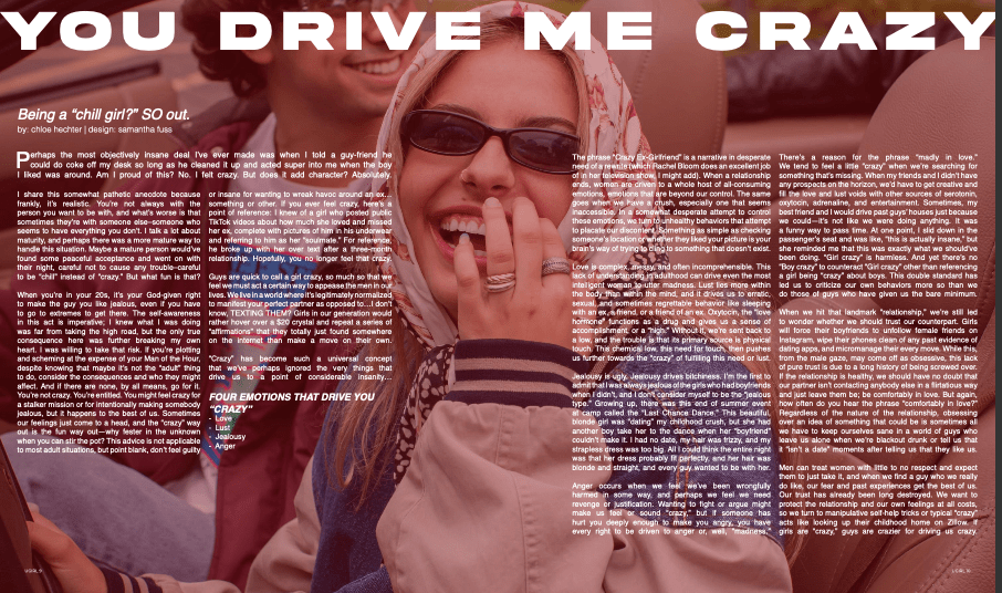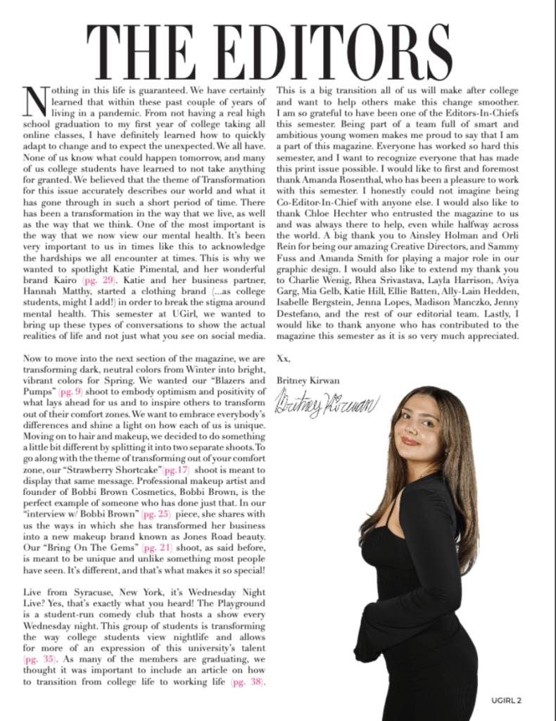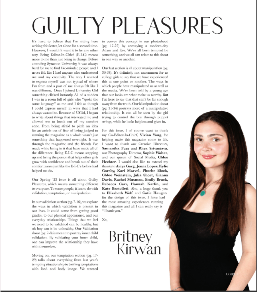 For the Spring ’22 and Spring ’23 semesters, I was Editor-In-Chief of University Girl. I published two print issues and had the opportunity to turn my creative ideas into a tangible form.