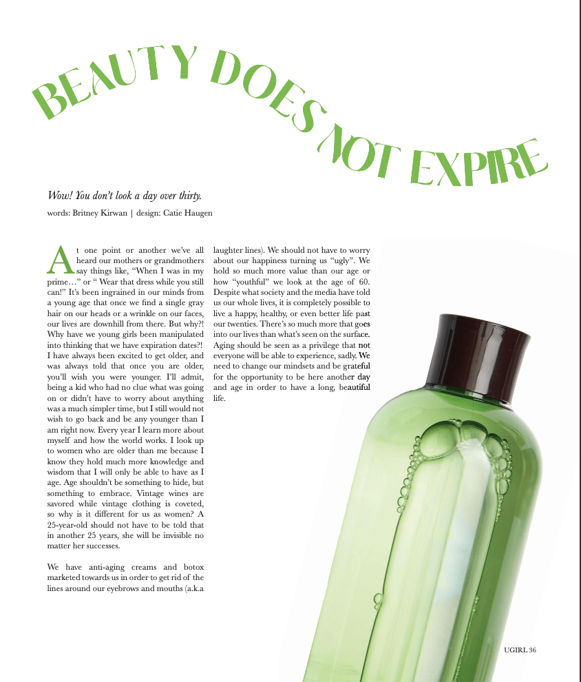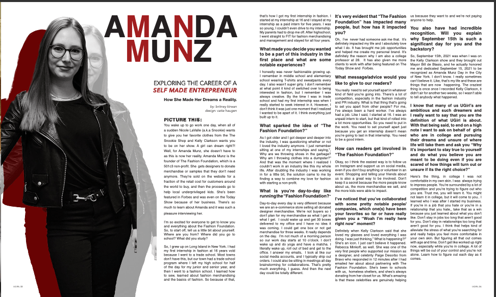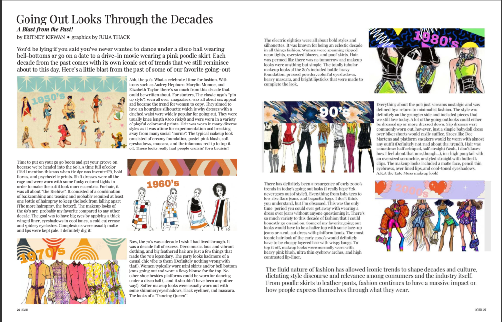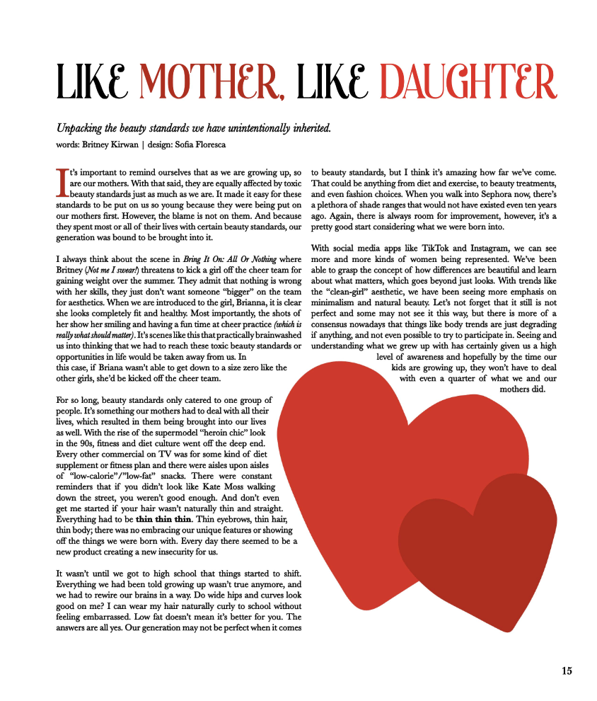 I have published three print articles between the Fall ’21, Fall ’22, Spring ’23, and Spring’24 semesters. The first article shown below is an interview with Amanda Munz, the founder of the Fashion Foundation. The Fashion Foundation is a non-profit organization that helps provide underprivileged kids obtain the school supplies they need by selling clothes that designers have been willing to donate. The second article talks about the beauty of aging and why it should be something to embrace as a woman, rather than hide. The third I article I wrote is about fashion trends throughout the decades. Lastly, the fourth article is all about beauty standards being passed down through each generation.